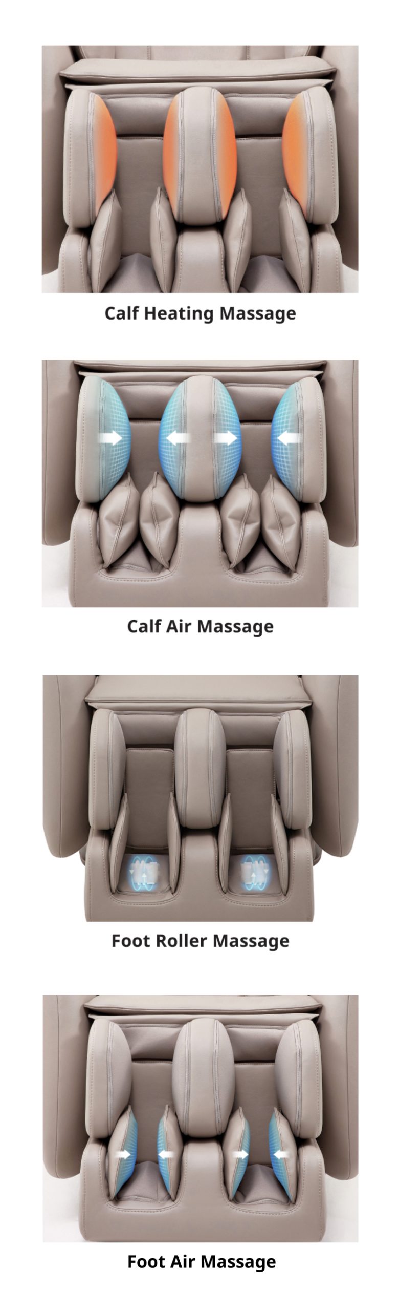 A thorough airbag massage provides a reflexology feature for your feet and thorough kneading of the knees and calves. You can adjust the airbag intensity to your liking from 1 to 5.